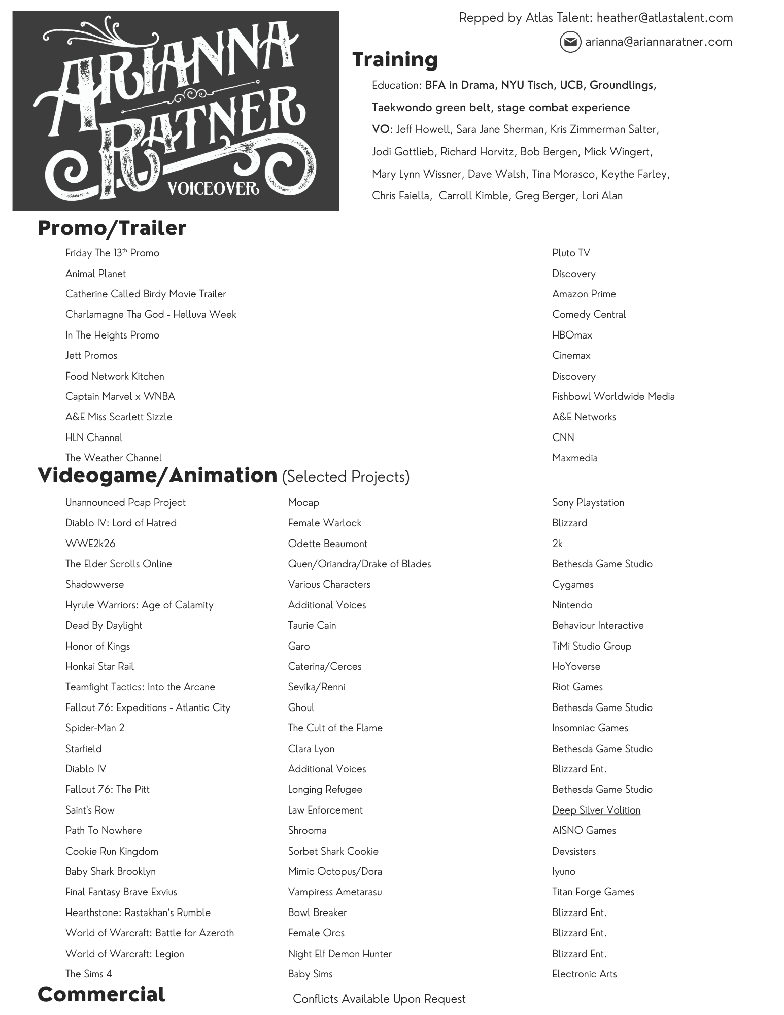 Arianna Ratner is a professional female video game voiceover artist with a great deal of experience in the genre. Her impressive credits include characters for World of Warcraft: Dragonflight, World of Warcraft: Legion, Cookie Run Kingdom, Hearthstone, The Sims 4, Elder Scrolls Online, Saints Row 4, and Lost Ark. Her voice is strong, powerful, and forthright.